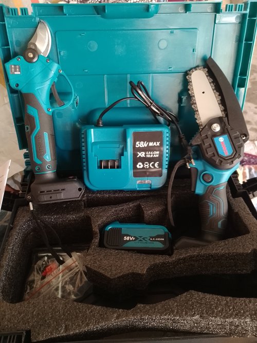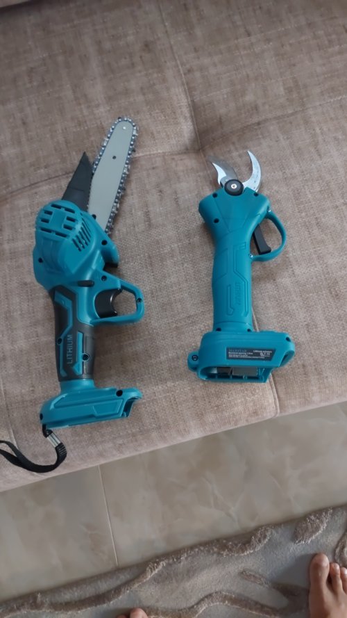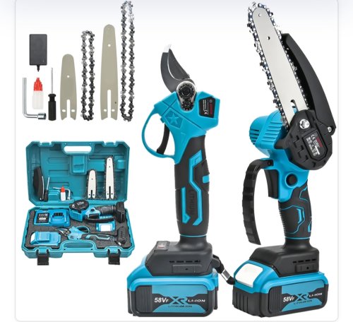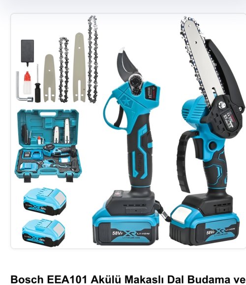 Professional Şarjlı Dal Budama Testeresi ve Budama makası 2 li set bir arada, 58vf 5ah çift akü ile işlerinizi kolaylıkla bitirin.Tek batarya ile 35 dk kesme imkanı sunuyor. 10cm ve 15 cm pala boyu ile tüm dalları kolaylıkla kesebilirsiniz.